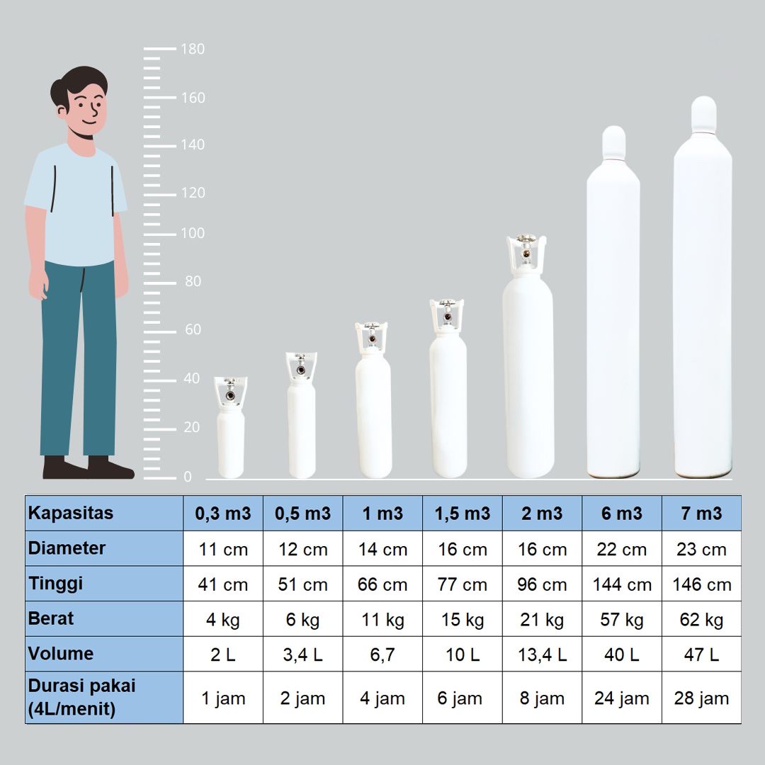 Tersedia berbagai ukuran tabung Oksigen mulai dari 0,3m3, 0,5m3, 1m3, 1,5m3, 2m3, 6m3, 7m3 dan 10m3.